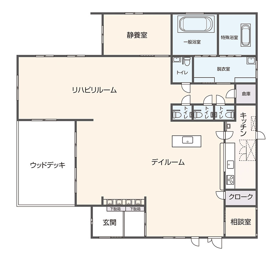 ご利用者様、ご本人様を支援するご家族様の気持ちを第一に考え、看護師、理学療法士、介護福祉士等の資格を有している専門職が、食事、入浴、機能訓練(リハビリ)を中心としたサービスです。